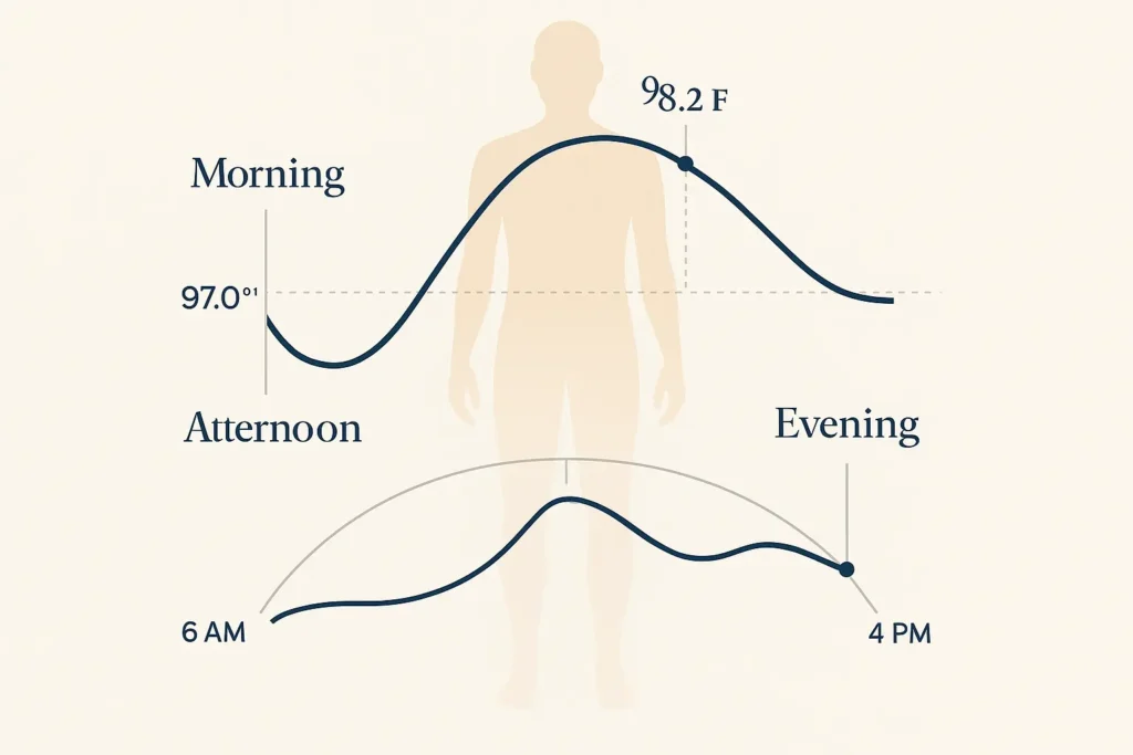 During sleep, your body conserves energy, cooling to its nightly nadir. This explains why morning readings often feel “low” but are physiologically typical. - Peak: Late Afternoon (~98.2°F/36.8°C):